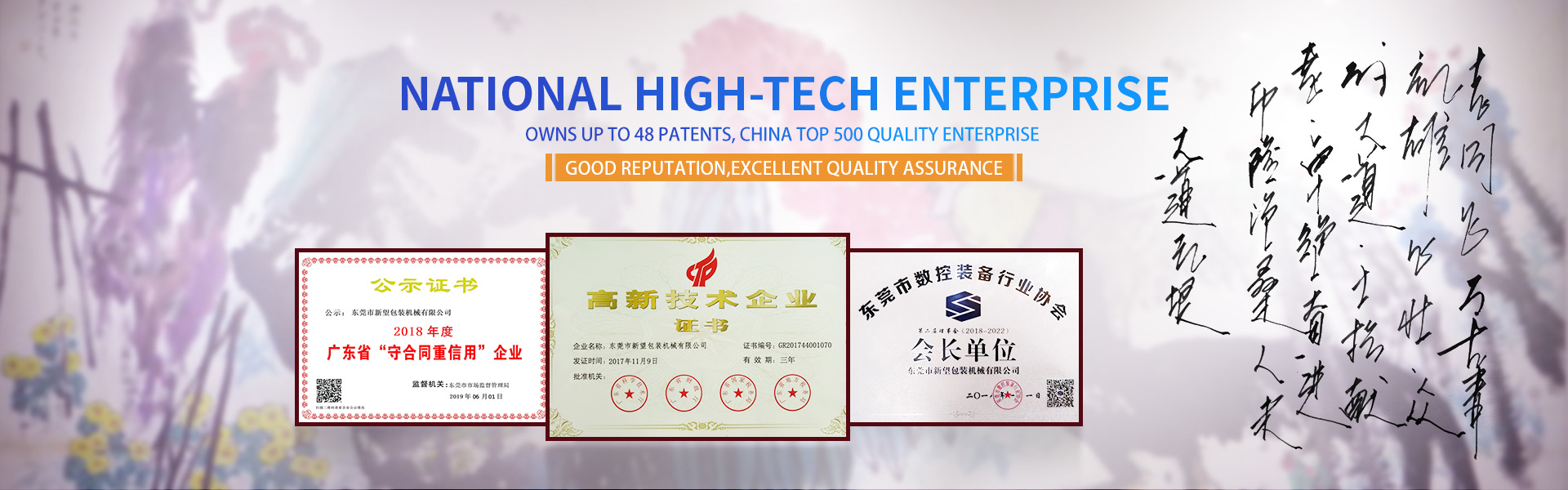 Xinwang Machinery was established in 1998 and is located in Dongping Village, Qishi Town, in the central area of the eastern industrial park in Dongguan City. It has convenient transportation, beautiful and comfortable environment, and a wide field of vision. The company has a registered capital of 20 million yuan and owns over 18000 square meters of offices, factories, and other facilities. We have passed the ISO9001:2008 international quality management system certification and hold a total of 58 national patents. It is a vice chairman unit of the Qishi Town Federation of Industry and Commerce in Dongguan, a vice chairman unit of the Qishi Town Federation of Literary and Art Circles in Dongguan, a vice chairman unit of the Dongguan Environmental Protection Packaging Industry Association, the second president unit of the Dongguan CNC Equipment Industry Association, an executive director unit of the Guangdong Packaging Technology Association, a well-known trademark enterprise in Guangdong Province, and a national high-tech enterprise.